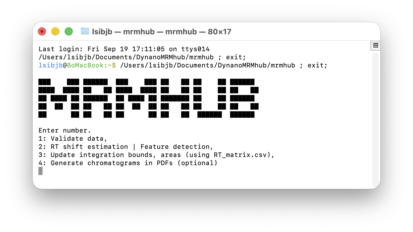 Upon execution, the software launches a command line prompt with four different menu options. For new datasets, the steps 1 - 3 are applied sequentially. The final step 4 is optional and only used when integration results as PDFs files are needed.