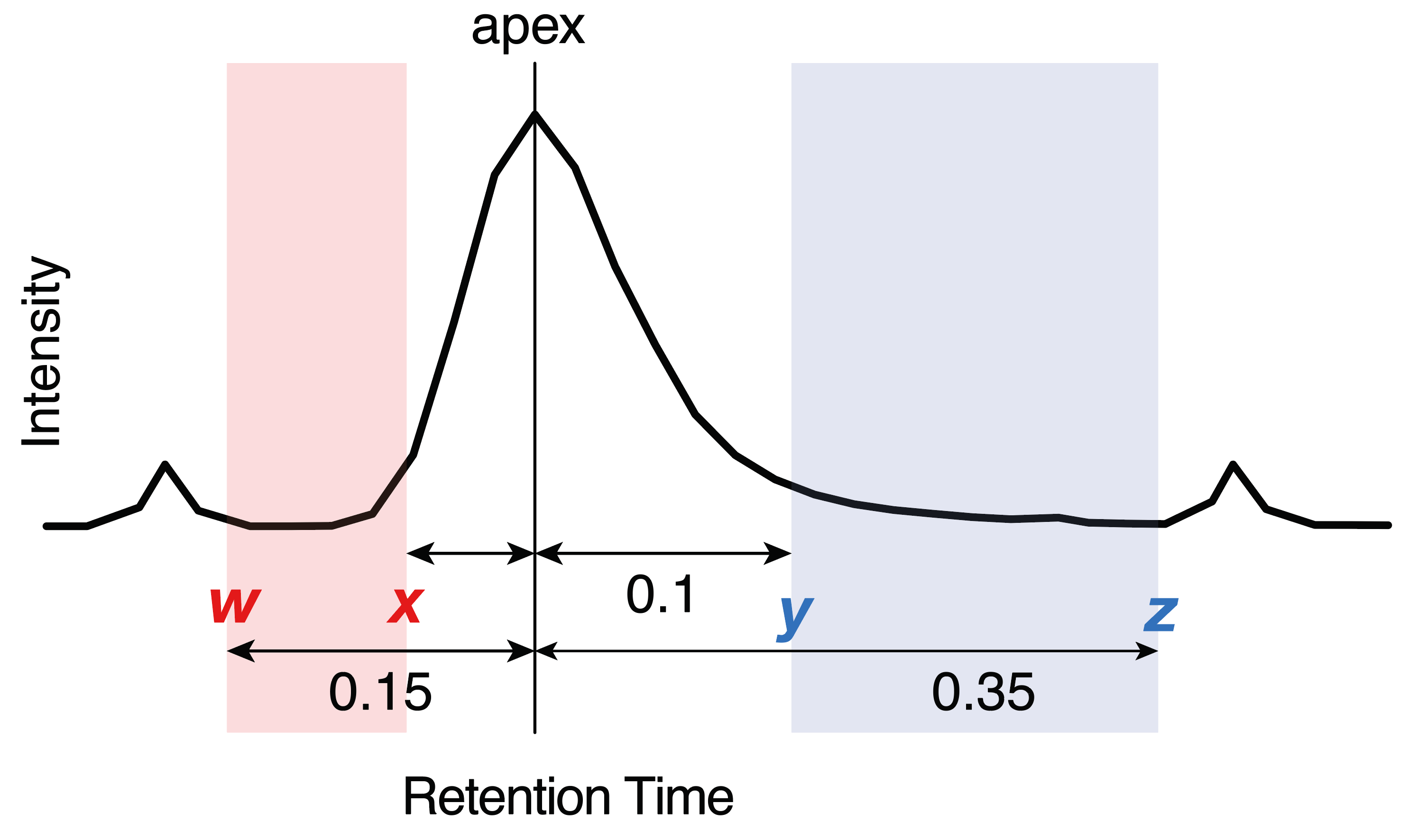 peak_width | [w, x, y, z] define allowed integration bounds: left = w–x min, right = y–z min from apex (see below). |