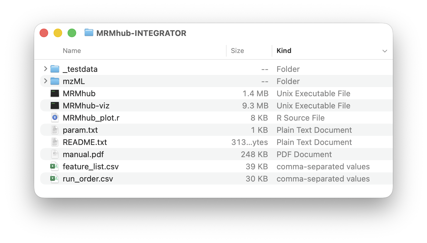 The INTEGRATOR module comes with pre-compiled binaries for Windows OS and macOS, which can be download from https://github.com/SLINGhub/MRMhub/releases. Unzip the downloaded file and move the folder to the desired location. The folder comprises following files and subfolders: MRMhub is the main application, the MRMhub-viz is an application to review the peak integration results. The input files required by the MRMhub application are feature_list.csv