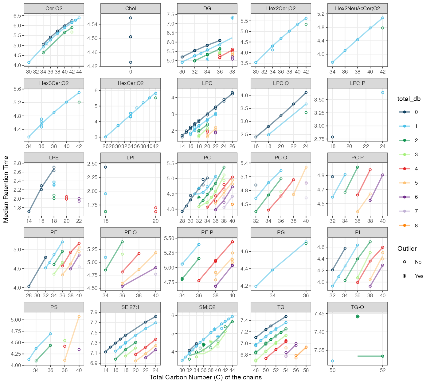 To check for potential peak picking errors, the retention time (RT) of lipid features can be plotted against the total carbon count and double bond number. Featyures that deviate from the trend are labelled and indicate potential misannotations or peak picking errors. However, the robustness of this approach depends on the comprehensiveness of the lipid species covered in the analysis. In this example, only a limited number of lipid featires were measured, and thus the trend is not well defined for some classes and double bond counts.