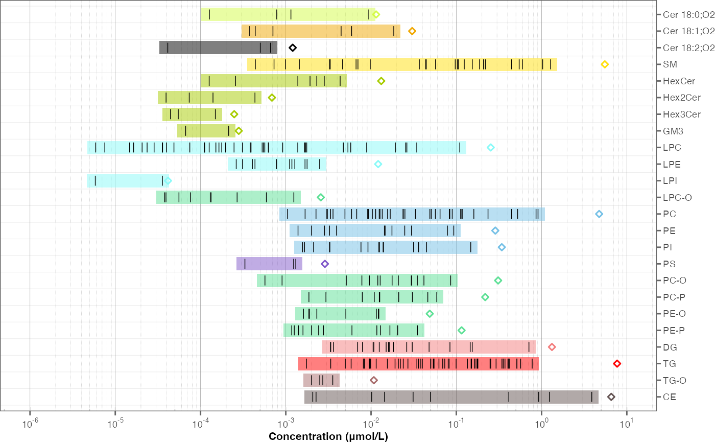 As a final overview, the feature concentration profile of the filtered dataset is shown below. Validating the concentrations, for example, those of the most abundant species, the summed concentrations per lipid class, or the ratios between lipid classes, against in-house reference values or literature data helps ensure that the quantification is within expected ranges and that no major quantification errors are present.