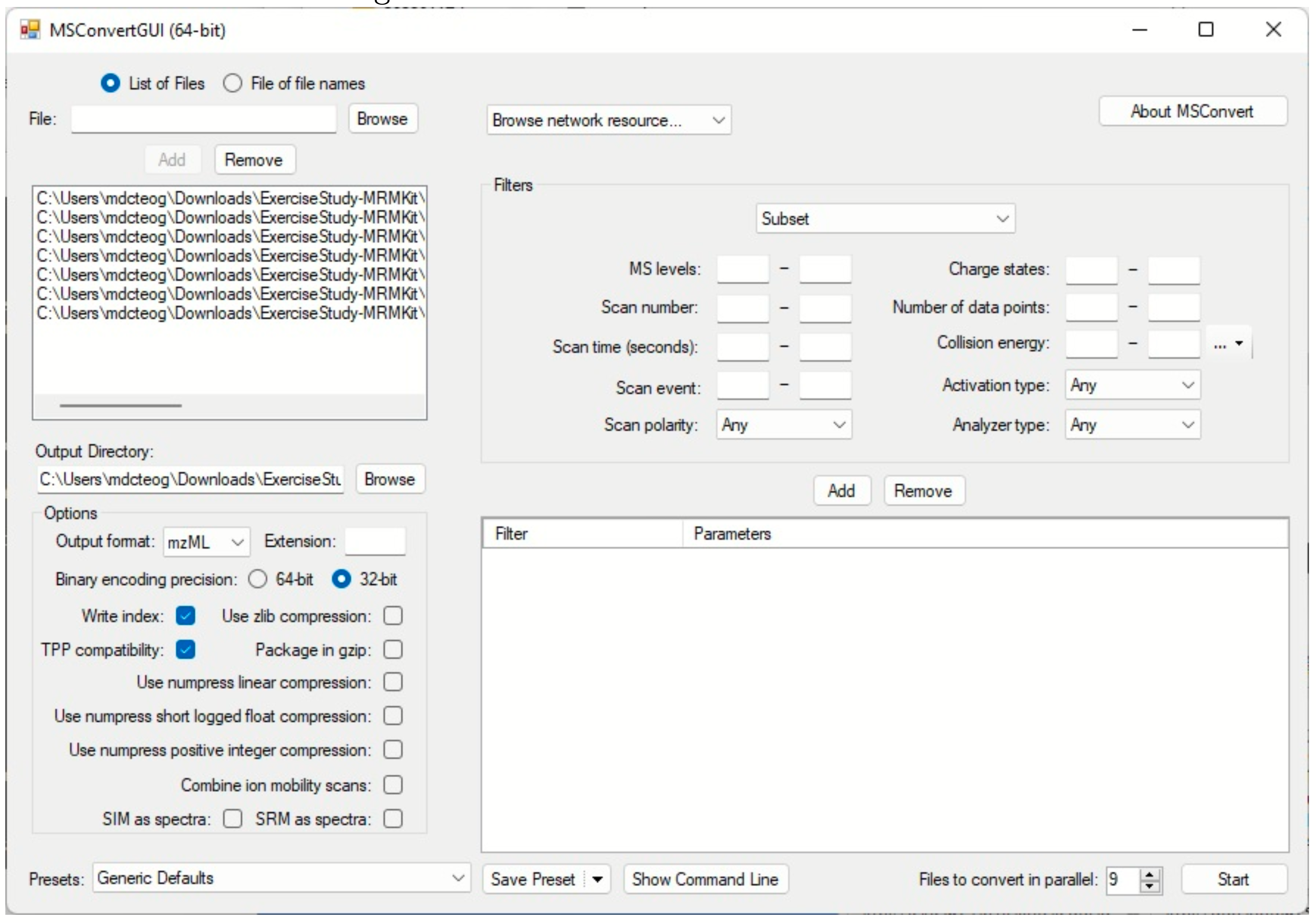 Set following options: “mzML” for “Output format”, “32-bit” for “Binary encoding precision”, check “Write index” and to improve performance, increase “Files to convert in parallel” to the number of available CPU cores.