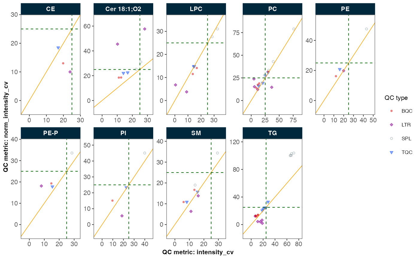 Evaluates the effectiveness of normalization by comparing feature variability (measured as %CV) in QC and/or study samples before and after normalization. The comparison is visualized through one of three plot types: